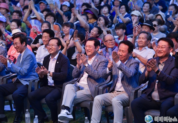 이용섭 광주세계마스터즈수영선수권대회 조직위원장 겸 광주광역시장이 5일 오후 광산구 남부대 마켓스트리트 특설무대에서 열린 2019광주세계마스터즈수영선수권대회 개최 기념 축하 콘서트에 참석해 김동찬 광주시의회 의장과 시의원, 조영택 조직위 사무총장, 시민 등과 즐겁게 공연을 관람하고 있다.