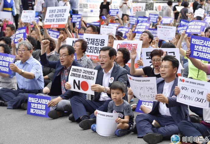 이용섭 광주광역시장이 10일 오후 동구 금남로에서 열린 '경제침탈 아베규탄! 한일군사정보보호협정 폐기! 광주시민대회'에 참석해 어린이와 피켓을 들고 나란히 앉아있다.