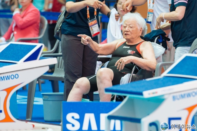 13일 오후 광주세계마스터즈수영선수권대회가 열리고 있는 남부대 시립국제수영장 주 경기장. 조용하던 경기장이 일순간 함성과 박수소리로 요란했다. 93세 할머니의 역영을 응원하는 관중들의 함성이었다.