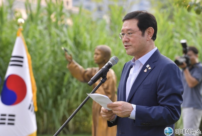 이용섭 광주광역시장이 14일 오후 시청 광장 '평화의 소녀상' 앞에서 열린 '일본군 위안부 피해자 기림의 날' 기념행사에 참석해 김동찬 광주시의회 의장, 장휘국 시교육감 등 참석자들과 국민의례를 갖고 인사말을 하고 있다.