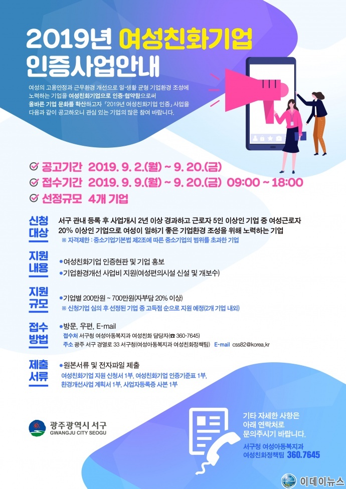 신청대상은 서구 소재 사업개시 2년 이상 경과한 근로자 5인 이상 기업가운데, 여성근로자가 20%이상인 기업으로 여성이 일하기 좋은 기업환경 조성을 위해 노력하는 기업이다.