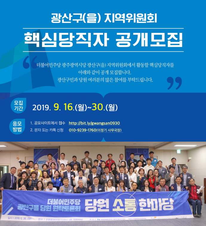 광산을지역위는 ▲조직강화특별위원회 ▲부위원장단 ▲특보단 ▲당원협의회장단 ▲각급 상설위원회 부위원장단 및 위원 등으로 활동할 당직자를 공모사이트(http://bit.ly/gwangsan0930)를 통해 지원받아 10월 중에 확정할 계획이다.