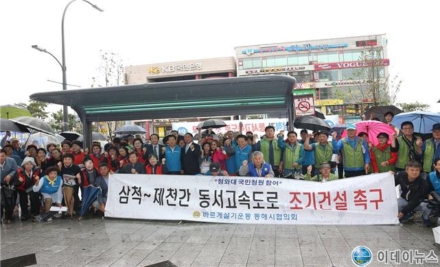 21일(토), 동해시 천곡동 대학로 일원에서 강원경제인연합회 주관으로, 삼척~제천간 동서고속도로 조기건설 촉구를 위한 청와대 국민청원 홍보 캠페인이 진행되었다.