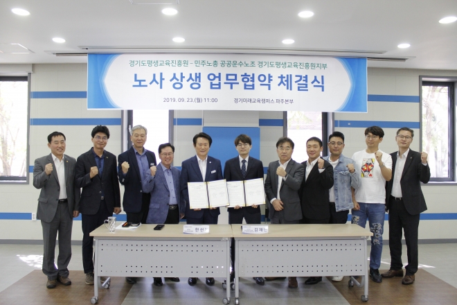경기도평생교육진흥원은 23일 경기미래교육파주캠퍼스에서 민주노총 전국공공운수노동조합 경기도평생교육진흥원지부와 ‘노동이 존중되는 경기도 구현’을 위한 업무협약을 체결하고, ‘노동인권 상담센터’ 출범을 위한 현판식을 개최했다.