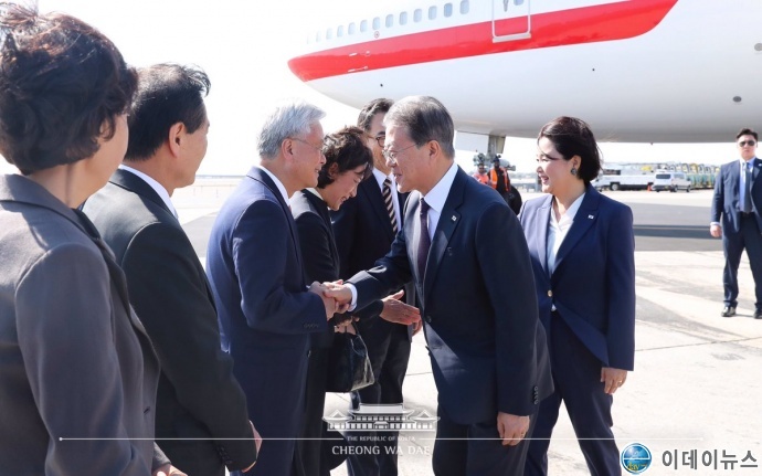 대한민국 청와대에서는 트위터를 통해 '문재인 대통령과 수행단이 13시간여 비행 끝에 유엔총회가 열리는 미국 뉴욕에 도착했습니다. 공항에서는 조태열 주유엔대사 부부, 조윤제 주미대사, 박효성 주뉴욕총영사 부부가 나와 대통령 부부를 영접했습니다.'라고 글을 올렸다.