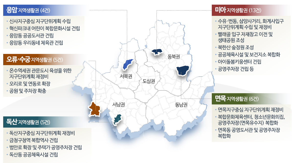 먼저 미아 지역생활권은 북한산 등 풍부한 자연경관을 보유하고 우이신설선 개통으로 역세권 연계를 통한 지역 활성화가 기대된다. 2개 중심지와 1개의 역세권을 대상으로 상업ㆍ업무 기능을 강화하고 지역 내 부족했던 공공체육시설과 우리동네키움센터를 새롭게 건립한다. 아울러 북한산 자연경관을 해치고 있는 빨래골 입구 자재창고를 이전하고 2022년까지 생태공원으로 조성한다.