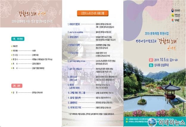 영광내산서원보존회(회장 강재원)에서는 오는 10월 5일 오후 3시에영광 상사화축제 상섦부대인 공연장에서 지역민과 관광객을 대상으로 2019년 향교 및 서원활성화 사업의 일환으로 ‘강항의 노래’ 콘서트를 개최한다.