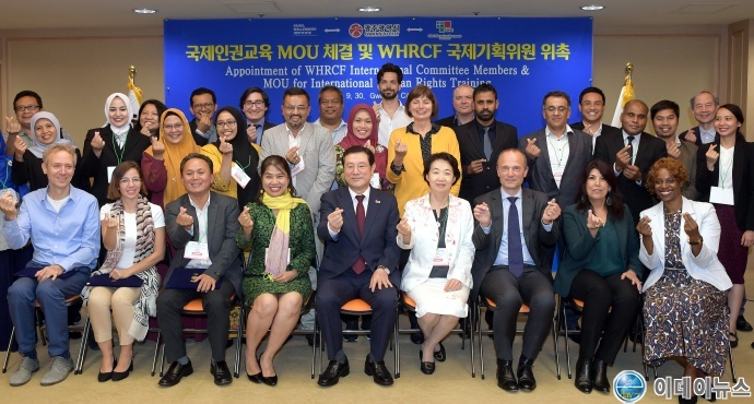 이용섭 광주광역시장이 30일 오후 시청 3층 비즈니스룸에서 열린 ‘국제인권도시 MOU체결 및 WHRCF 국제기획위원 위촉식’에 참석해 위촉 및 협약서 서명 후 다함께 기념촬영을 하고 있다.