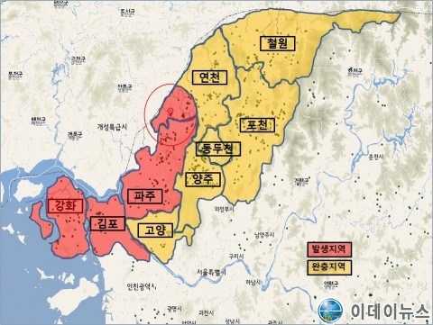 완충지역은 ‘고양·포천·양주·동두천·철원’과 연천군 발생농가 반경 10km 방역대 밖이다. 완충지역은 수평전파의 주요 요인인 차량 이동을 철저히 통제하고 지역 내 모든 농가를 대상으로 정밀검사와 농장단위 방역 강화조치를 실시한다.