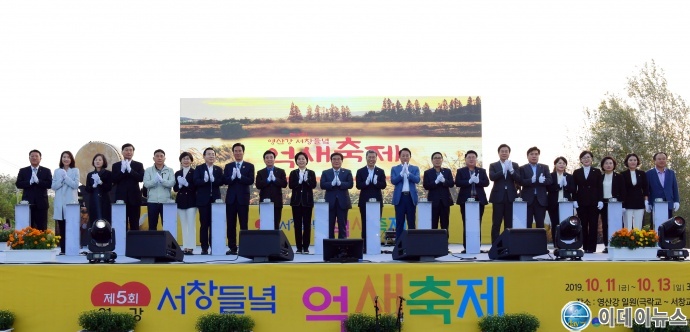 이병훈 광주광역시 문화경제부시장이 11일 오후 서구 영산강 자전거길 안내센터 앞에서 열린 ‘제5회 영산강 서창 들녘 억새축제’에 참석해 주요내빈들과 함께 축제 시작 터치버턴을 누르는 퍼포먼스 후 기념촬영을 하고 있다.