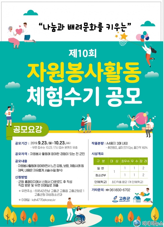 군 관계자는 “우리군은 소록도 자원봉사, 독거노인 안부 살피기, 벽화봉사, 강원도 산불 복구지원 등 묵묵히 어려운 이웃에게 힘이 된 자원봉사자가 많다”며“체험수기 공모를 통해 가슴 따뜻한 이야기를 함께 나누는 계기가 되길 바란다”고 말했다.