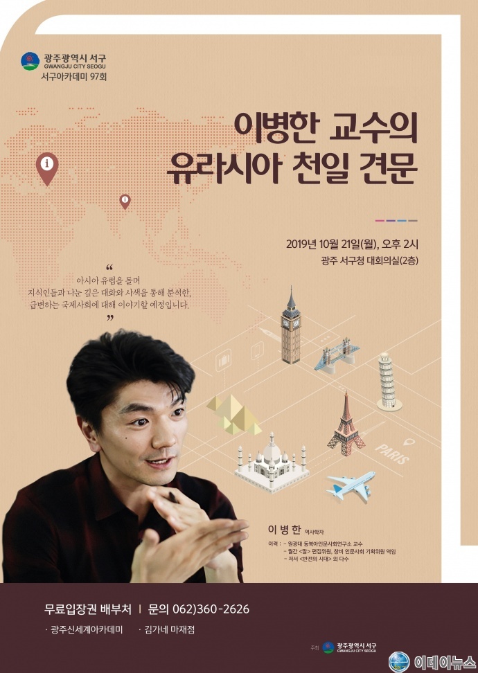 광주 서구가 오는 21일 오후 2시 주민들을 대상으로 ‘유라시아 견문’의 저자로 유명한 이병한 원광대학교 교수를 초청, 제97회 서구 아카데미를 개최한다.