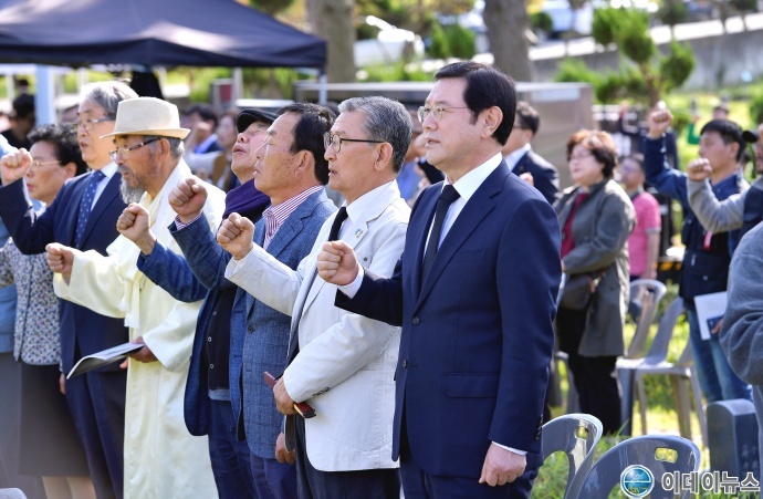 이용섭 광주광역시장이 19일 오후 북구 망월동 '민족민주열사묘역'(옛 5·18구묘역)에서 열린 '2019 호남 민족민주열사 희생자 합동 추모제'에 참석해 문경식 한국진보연대 상임공동대표, 김석진 호남유가협 회장, 유가족 등과 임을 위한 행진곡을 부르고 있다.