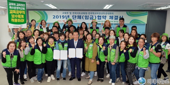 교육부 및 17개 시도교육청과 전국학교비정규직연대회의가 10월 21일 오후 3시 전국시도교육감협의회 5층 회의실에서 단체(임금)협약 체결식을 가졌다.