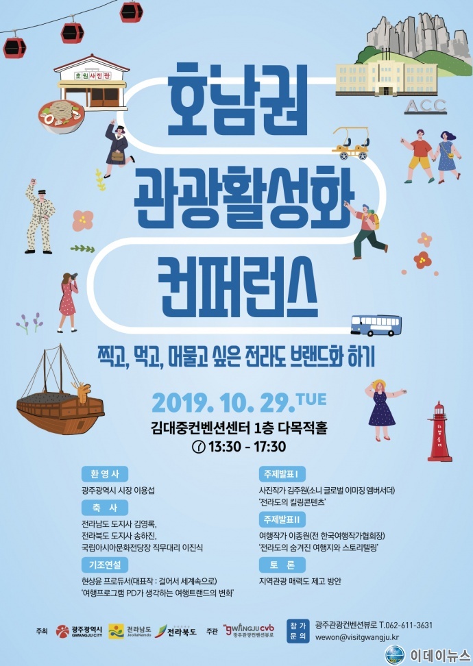 광주광역시는 전라남도, 전라북도와 함께 호남권 관광활성화를 모색하기 위해 오는 29일 김대중컨벤션센터 다목적홀에서 ‘2019 호남권관광활성화컨퍼런스’를 개최한다.