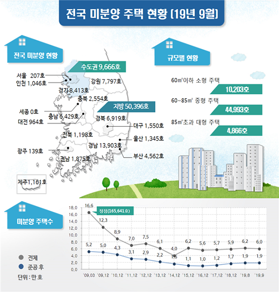 국토교통부(장관 김현미ㆍ이하 국토부)는 지난 9월 말 기준으로 전국의 미분양 주택이 6만62가구로 집계됐다고 지난 30일 밝혔다. 이는 전월 6만2385가구 대비 3.7%(2323가구) 감소한 수치다.
