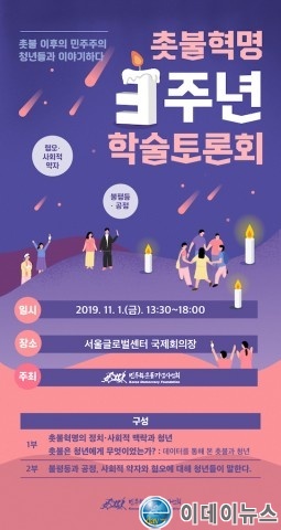 민주화운동기념사업회(이사장 지선, 이하 사업회)는 11월 1일(금) 오후 1시 30분 서울글로벌센터 국제회의장에서 ‘촛불 이후의 민주주의_청년들과 이야기하다’를 주제로 촛불혁명 3주년 학술토론회를 개최한다고 밝혔다.