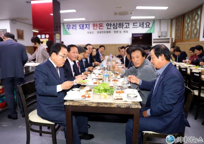 김준성 영광군수는 4일 한돈협회 임원진들과 함께한 자리에서 “우리나라에서 판매하는 돼지고기는 ASF로부터 안전함을 홍보하기 위하여 전 직원이 함께하고 있다.”며 “가격이 안정화 될 때까지 돼지고기 안전성 홍보와 함께 양돈농가의 위기 극복을 위해 최선의 노력을 다하겠다.”고 한돈농가를 격려했다.