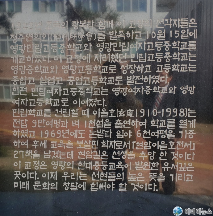 “1945년 조국의 광복과 함께 이 고장 정주연학(硏學)회를 발족하고 영광민립고등중학교와 영광민립여자고등중학교를 개교하였다. 이 교정에 자리했던 민립고등중학교는 영광중학교와 영광고등학교로 성장하고 고등학교는 종합고 실업고 공업고등학교로 발전하였다.