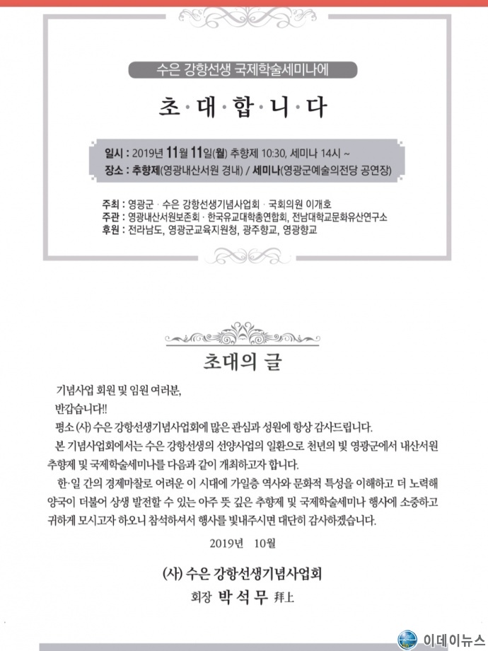 오는 11윌 11일 오전 10시 30분부터 영광내산서원보존회(회장 강재원 이하 보존회)에서는 내산서원 용계사에서 처음으로 "수은선생 추향제"를 봉향한다.