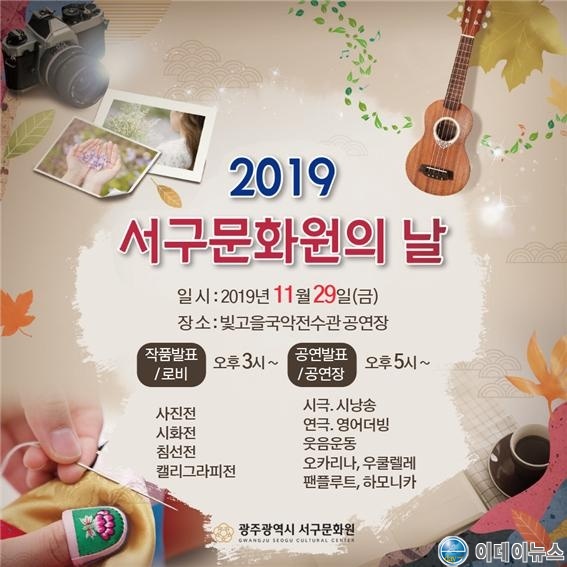 광주 서구문화원 회원들이 1년 동안 문화교실을 통해 수업받은 결과를 작품으로 발표하는 서구문화원의 날 행사가 11월 29일 광주시 서구 금호동 빛고을국악전수관 공연장과 로비에서 열린다.
