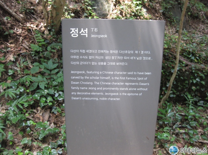 공이 다산으로 옮긴 뒤 대를 쌓고 못을 파고, 꽃나무를 열 지어 심고, 물을 끌어 폭포를 만들고, 동쪽 서쪽에 두 암자를 짓고, 서적 천여 권을 쌓아놓고 글을 지으며 스스로 즐기고 석벽(石壁)에 정석(丁石) 두자를 새겼다. 이때에 다산은 여러 제자들에게 주역을 가르쳤다.”
