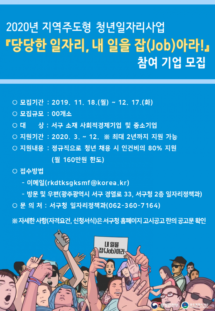 광주 서구가 오는 12월 17일까지 2020년 지역주도형 청년일자리사업 「당당한 일자리, 내 일을 잡(Job)아라!」참여기업을 공개모집한다.