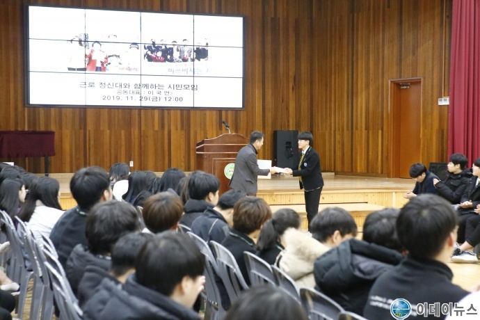 동명고등학교(교장 이명석)가 학교 축제(백합제)에서 발생한 수익금 75만 7000원을 11월 29일(금) 근로정신대 할머니와 함께하는 시민모임(이국언 공동대표)에 후원금으로 전달했다.