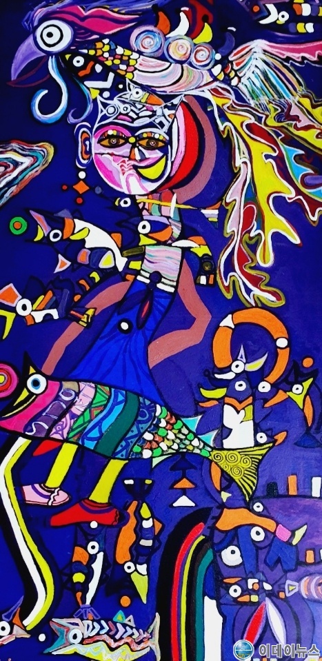 또, 신화백 작품의 특징은 반드시 봉황과 함께 마주보는 남녀가 있으며 물고기가 반드시 그림 속에 포함이 되고 물고기를 머리에 이고 있는 여인을 반드시 포함시켜 나름 여인의 삶이라는 의미도 부여하고 있다는 것!!