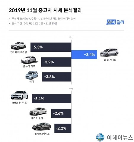 온라인 내차팔기 서비스 헤이딜러에서 2019년 11월 중고차 시세 분석 결과를 6일 공개했다.
