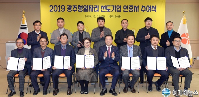 광주시는 24일 시청 비즈니스룸에서 이용섭 시장과 인증기업 대표 등이 참석한 가운데 광주형일자리 선도기업 인증서 수여식을 개최했다.