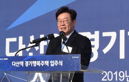 지난 22일 남양주시 다산진건 공공택지지구에서 열린 `다산역경기행복주택` 입주식에서 이 지사는 "최근 `달팽이도 집이 있는데 나는 왜 집이 없나`라는 말이 있다. 집 때문에 고생하고 좌절하는 나라를 바꿔야 한다"며 "임기 내에 경기도 자체 예산만으로 4만1000가구 공공임대주택을 공급하려 한다"고 전했다.
