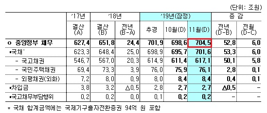 지난 8일 기획재정부(이하 기재부)가 발간한 `월간 재정동향 2020년 1월호`에 따르면 2019년 11월 말 기준 중앙정부 채무는 704조5000억 원으로, 2000년 통계 집계 이후 처음으로 700조 원을 넘어섰다.