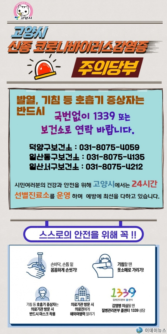 한편 시 관계자는 중국 방문자 등 발열, 기침 등의 호흡기 의심증상자는 질병관리본부(국번없이 1339) 또는 선별진료소로 지정된 3개 보건소(덕양보건소, 일산동구보건소, 일산서구보건소), 명지병원, 일산병원, 일산백병원 등으로의 신고를 당부했다.