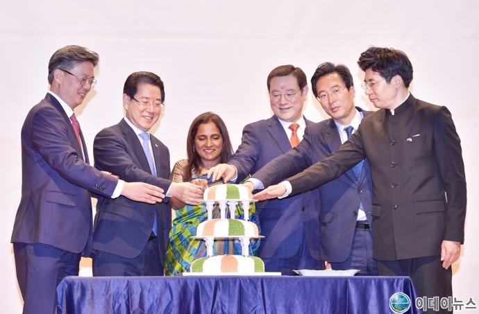 이용섭 광주광역시장이 31일 오후 서구 김대중컨벤션센터 4층 컨벤션홀에서 주한 인도대사관 주관으로 열린 '인도공화국의 날' 리셉션에 참석해 스리프리아 랑가나탄 주한 인도대사, 김영록 전남도지사, 장재복 외교부 공공외교대사, 장재성 광주시의회 부의장 등 내빈들과 케익커팅식을 하고 있다.