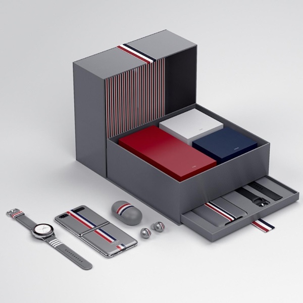 이번 구성은 삼성전자의 스마트 제품에 톰 브라운의 상징인 삼색 줄무늬 디자인이 결합한 패키지다. 삼성전자 폴더블폰 `갤럭시 Z 플립`과 함께 스마트워치 `갤럭시 워치 액티브2`, 무선이어폰 `갤럭시 버즈 플러스`가 한 세트로 구성됐다.