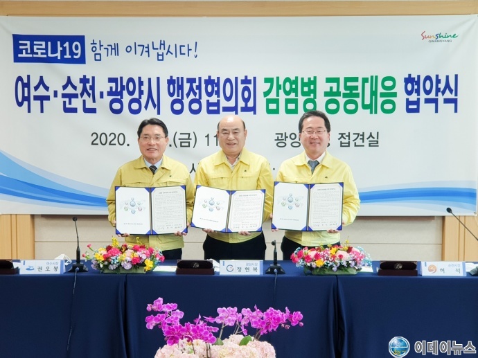 여수․순천․광양시 행정협의회는 6일 광양시청 접견실에서 코로나19 감염병 확산 방지를 위한 긴급회의를 개최하고 ‘공동대응 업무협약’을 체결했다고 6일 밝혔다.