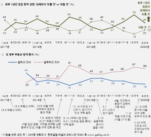 한편, 향후 1년간 집값 전망을 물은 결과 37%가 `오를 것`이라 답했고 21%는 `내릴 것`, 24%는 `변화 없을 것`으로 내다봤으며 17%는 의견을 유보했다. 해당 질문에 대해서는 3개월 전과 비교하면 집값 상승 전망이 18%p 감소, 하락 전망은 9%p 증가했다. 이에 대해 갤럽은 현 정부 출범 후 상승 전망 최고치(55%)를 기록했던 작년 12월의 과열 분위기는 다소 잦아든 것으로 보인다고 전했다.