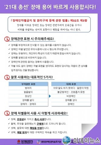 선거 참여자들이 활용할 수 있도록 배포되는 자료에는 △원고 작성과 발언 시에 장애에 관련하여 바르게 표현할 수 있도록 6가지 주의사항 △잘못 사용하는 대표적인 용어 5가지(벙어리, 절름발이, 정상인, 장애를 앓다, 장애자·장애우)를 선정하여 대체표현 제시 △장애 차별용어를 사용했을 경우 올바른 사과 방법을 안내하고 있다.