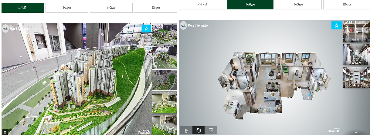 단지의 입지와 배치, 가구 타입별 구조, 자재, 특장점 등을 설명하는 안내 동영상뿐만 아니라 3D 조감도 및 VR 영상, 평면도 등을 함께 볼 수 있도록 배치해 수요자들의 이해를 도왔다.
