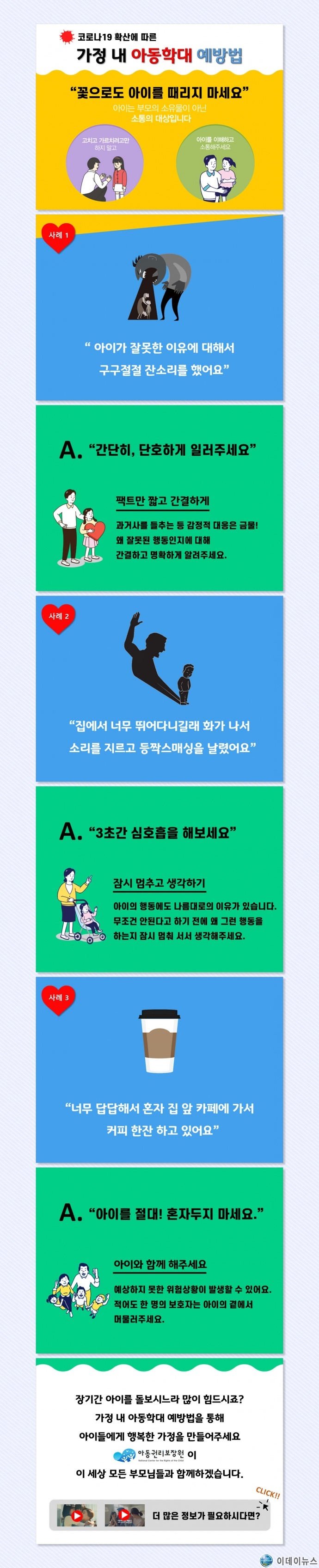 아울러, 아동권리보장원은 ‘되찾아요, 우리의 일상. 코로나19 이겨내기’ 대응지침을 통해 올바른 양육방법뿐 아니라 가족마음 방역, 아동과 보호자가 참고할만한 놀이·학습 콘텐츠 및 아동 이용시설 예방수칙 등을 제공한다.