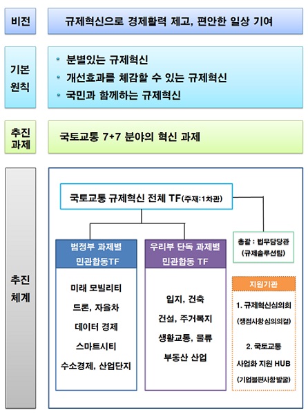 `규제혁신 추진계획`은 ▲분별 있는 규제혁신 ▲개선효과를 체감할 수 있는 규제혁신 ▲국민과 함께하는 규제혁신이라는 3가지를 기본 원칙으로 7+7 규제혁신과제 선정, 규제혁신 추진을 위한 `국토교통 규제혁신 TF(1차관 주재)` 구성 및 운영 등을 주요 골자로 한다.
