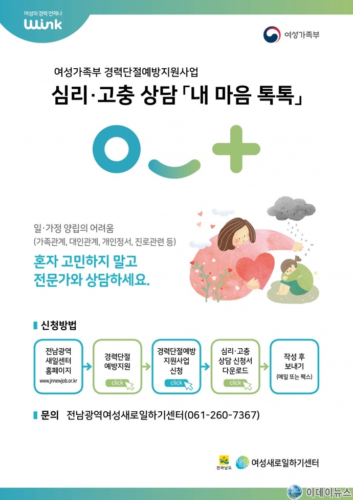 본 사업은 여성가족부와 전라남도의 지원으로 여성들의 안정적인 노동시장 진입(재진입)을 돕고 상담자의 가족관계, 대인관계, 개인 정서 문제, 진로 관련 어려움을 함께 고민하고 해결방안을 모색하여 여성의 경력단절을 예방하고 고용을 지속할 수 있도록 상담 지원한다.