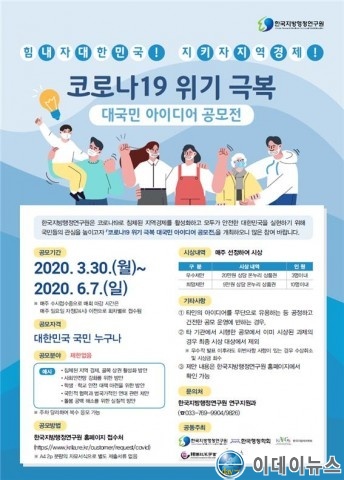한국지방행정연구원(원장 윤태범)이 코로나19로 침체된 지역경제를 활성화하고 모두가 안전한 대한민국을 실현하기 위해 전 국민을 대상으로 ‘코로나19 위기 극복 대국민 아이디어 공모전’을 개최한다고 3월 31일 밝혔다.