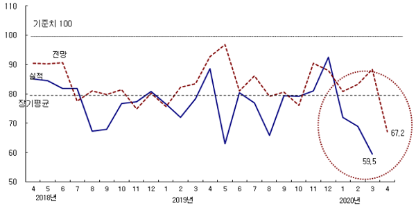 지수가 60선 아래로 떨어진 것은 2013년 2월(54.3) 이후 7년 1개월 만이다. 3월 지수가 10p 가까이 하락한 것도 2008년 3월(-16.8p) 이후 처음이다. 통상 3월은 봄철 발주 증가로 3~5p 상승하는 것이 일반적이다.