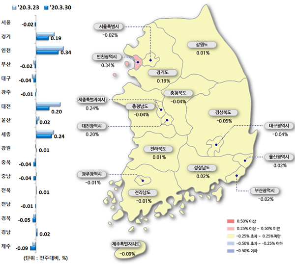 지방은 지난주(0.02%) 상승에서 보합 전환했다. 시ㆍ도별로 세종(0.24%), 대전(0.2%), 울산ㆍ경남(0.02%) 등은 상승했고, 제주(-0.09%), 경북(-0.05%), 충남ㆍ충북ㆍ대구(-0.04%) 등은 하락했다.