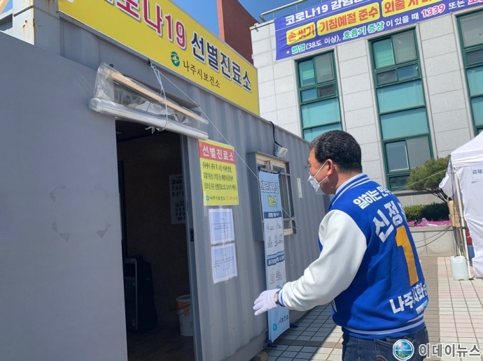 이날 신정훈후보는 선별진료소 운영실태를 점검하고, 지역사회 방역체계와 방역 대응 현황에 대한 논의와 현장근무자들의 애로사항을 청취하고 철저한 차단 방역과 대응을 요청했다.