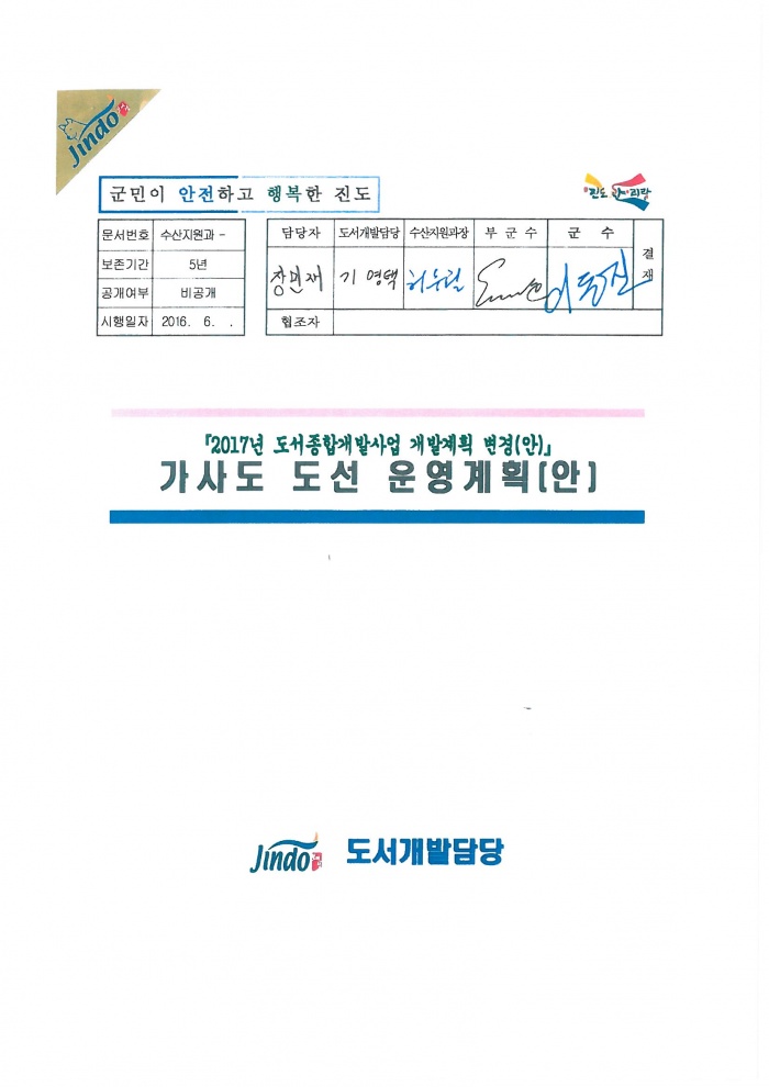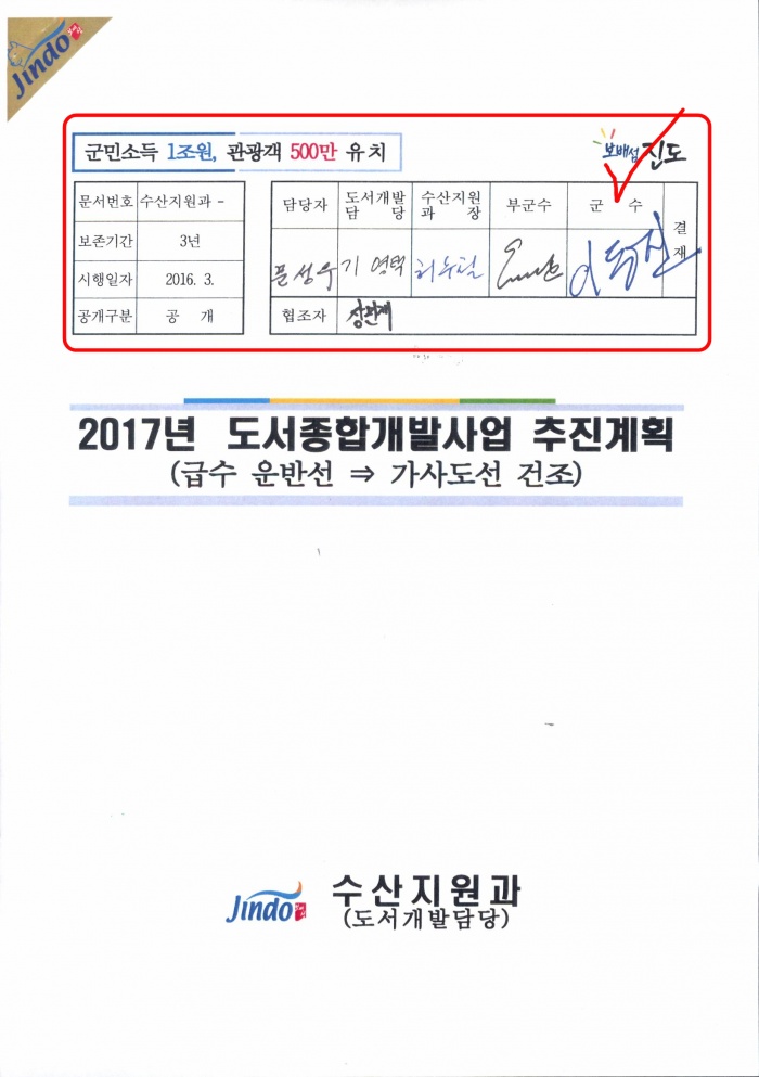 ▼ 아래 문건은 2016년 3월 진도군에서 자체 생산한 '급수 운반선 → 가사도선 건조' 관련 내용이다. 추진계획 변경을 검토하면서 내부적으로 '국토부 사업계획 변경 승인이 필요하다' 고 결론내고 있다. 이동진 진도군수의 결재 사항임.
