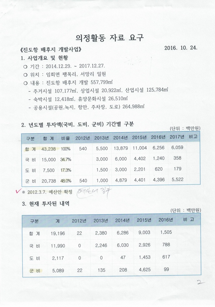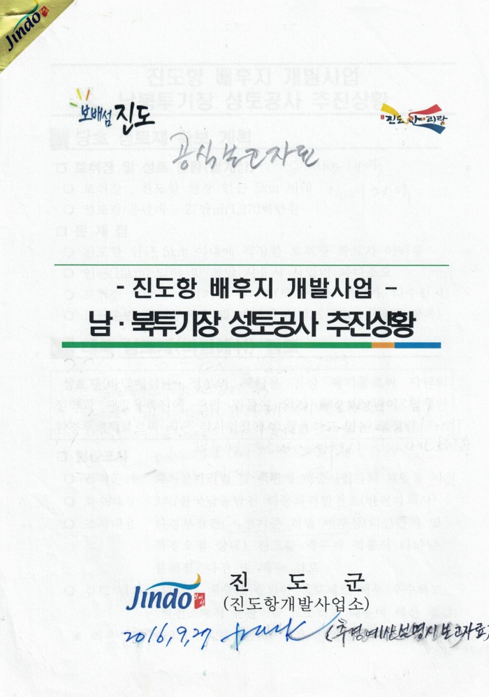 진도군은 2016년 9월 27일, 이 사업 관련 추경예산을 편성하기 위해 진도군의회에 ‘진도항 배후지 개발사업, 남·북투기장 성토공사 추진상황’ 보고서를 제출하고 설명했다.