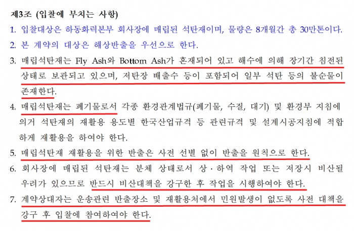 화력발전소가 석탄재 반출 용역을 할 때, 제시하는 입찰조건에는 공통적으로 ‘민원에 대한 사전적 대책을 강구한 후 입찰에 참여해야 한다’고 나와 있고, ‘입찰유의서와 계약특수조건’에서도 민원해결의 책임을 폐기물업체에 강제하고 있었다.
